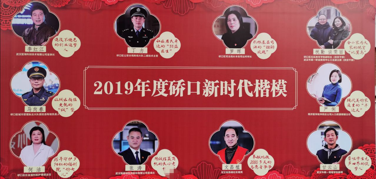 2019年12月根據(jù)硚口區(qū)委精神文明建設(shè)指導(dǎo)委員會(huì)《關(guān)于在全區(qū)開展2019年度“硚口新時(shí)代楷?!蓖圃u(píng)活動(dòng)的通知》(硚文明委〔2019〕6號(hào))要求按照“動(dòng)員發(fā)動(dòng)、民主推薦、評(píng)選審定”的程序,經(jīng)區(qū)委文明委研究,確定2019年度“硚口新時(shí)代楷?!焙蜻x人10名,我司董事長(zhǎng)張濤同志成功當(dāng)選“硚口新時(shí)代楷?!狈Q號(hào)。