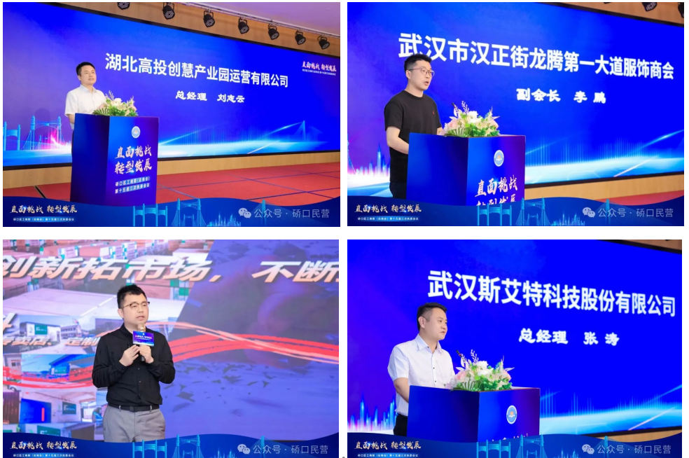 會上,高投創慧大健康產業園總經理劉志云、武漢市龍騰第一大道服飾商會副會長李鵬、武漢怡安居兔寶寶商貿有限公司總經理丁瑤、武漢斯艾特科技股份有限公司董事長張濤等四位優秀民營企業家代表作了經驗交流分享