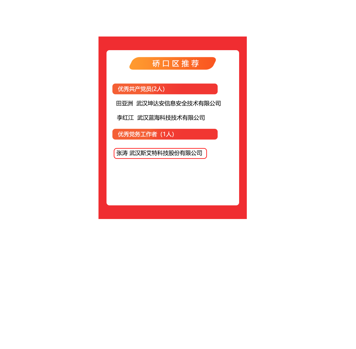 2020年7月1日,武漢市委網(wǎng)信辦、市互聯(lián)網(wǎng)行業(yè)黨委發(fā)布了《通報表揚全市互聯(lián)網(wǎng)行業(yè)優(yōu)秀共產(chǎn)黨員和優(yōu)秀黨務(wù)工作者》的文章,對全市互聯(lián)網(wǎng)行業(yè)70名優(yōu)秀共產(chǎn)黨員和30名優(yōu)秀黨務(wù)工作者予以通報表揚。